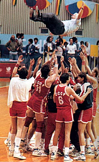 Олимпийские игры в Сеуле (1988). Триумф сборной СССР по баскетболу. Качают старшего тренера Александра Гомельского.