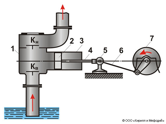 Схема приводного поршневого насоса одинарного действия: 1 — рабочая камера; 2 — поршень; 3 — цилиндр; 4 — шток; 5 — крейцкопф; 6 — шатун; 7 — маховик; Кн — нагнетательный клапан; Кв — всасывающий клапан.