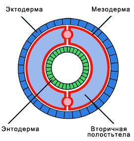 Тело кольчатых червей состоит из трех слоев клеток: эктодермы, энтодермы и мезодермы. Все пространство между внутренними органами занимает вторичная полость тела, или целом, имеющая собственные стенки.