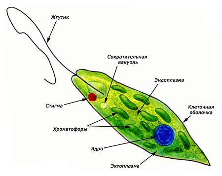 На переднем конце клетки эвглены расположен жгутик. В его основании находятся сократительная вакуоль и светочувствительный глазок. В заднем конце клетки расположено ядро, а в цитоплазме - хроматофоры.