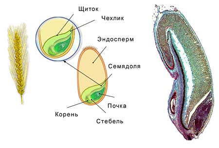 На поперечном разрезе семени пшеницы выделяются: эндосперм и зародыш. Эндосперм - место хранения питательных веществ. У зародыша есть одна семядоля, зародышевый корешок, зародышевый стебелек и зародышевая почечка.