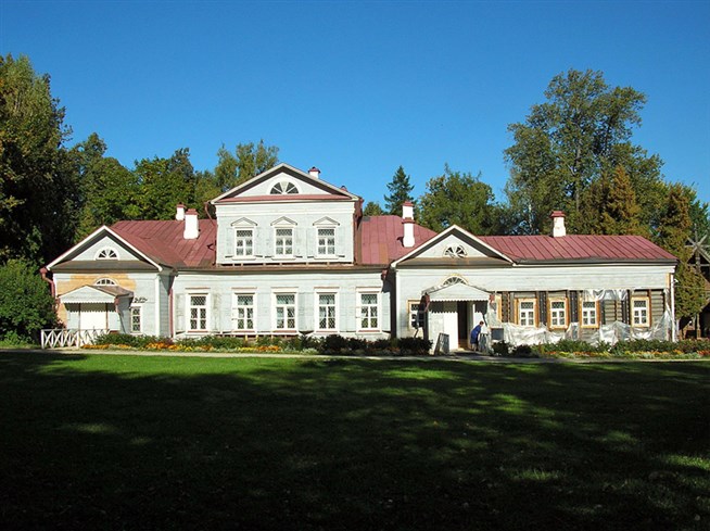 Абрамцево. Главное здание усадьбы. Скромный одноэтажный, обшитый тесом дом с мезонином, был построен еще в 1770-е годы. В 1843 году усадьбу купил писатель С. Т. Аксаков. У него часто гостили друзья — писатели и поэты Н. В. Гоголь, И. С. Тургенев, Ф. И. Тютчев и другие.