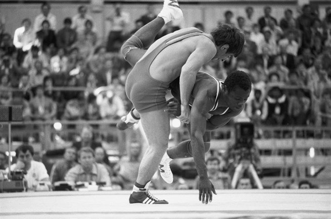 XXII Летние Олимпийские игры. Схватка борцов: слева - золотой призер Олимпиады-80 Магомедгасан Абушев (СССР), справа - Огустин Атаси (Нигерия). Соревнования по вольной борьбе в весовой категории до 62 кг. Россия, Москва. 25 июля 1980 г. Фото: Владимир Родионов, архив РИА новости