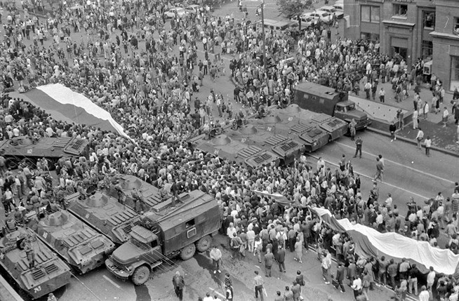 Москва. Тверская улица. 21 августа 1991 года. БТР пропускают колонну демонстрантов.