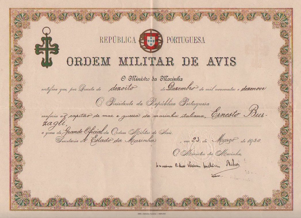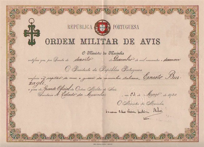 Диплом о присвоении степени гранд-офицера Ависского военного ордена капитану военно-морских сил Италии Эрнесто Бурцальи, подписанный военно-морским министром Португалии. Март 1920 года. Источник: Alexandru Uiuiu, wikimedia.org