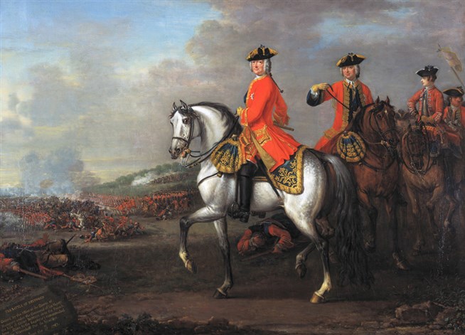 Джон Вуттон (1682-1764). Король Георг II в битве под Деттингеном 27 июня 1743 года со своим третьим сыном принцем Вильгельмом-Августом, герцогом Камберлендским (1721-1765) и лордом Робертом Дарси (1718-1778). 1743 год. Холст, масло. Это было последнее сражение, в котором царствующий британский монарх лично руководил своими войсками на поле битвы.