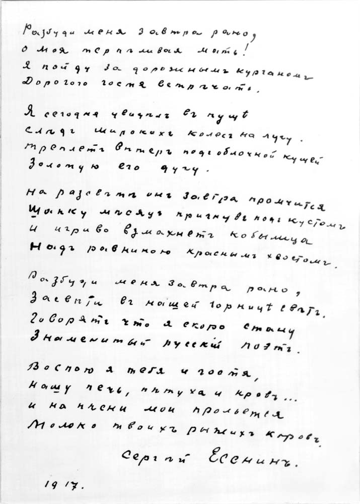 Автограф стихотворения С.А. Есенина «Разбуди меня завтра рано» (1917)