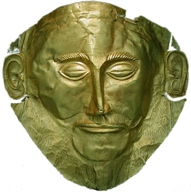 Золотая посмертная маска, известная как «маска Агамемнона», была найдена в могильнике № 5 в Микенах Генрихом Шлиманом в 1876 году. Маска датируется 16 веком до н.э.; хранится в Национальном археологическом музее в Афинах.