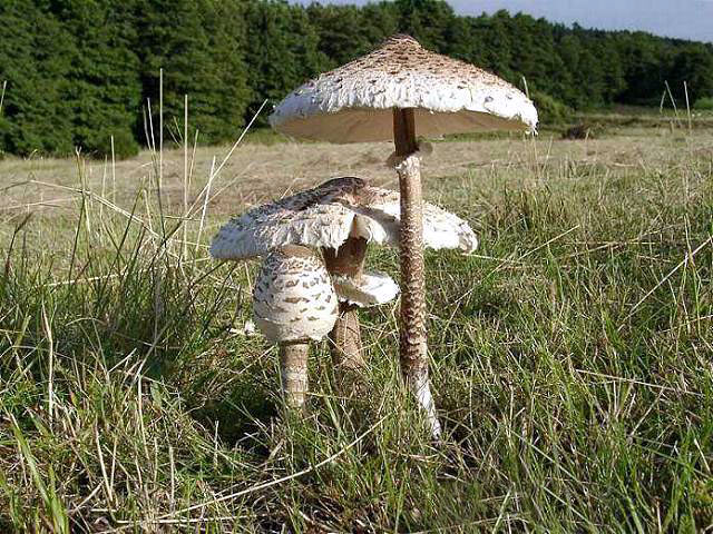Гриб-зонтик пестрый (Macrolepiota procera), у молодого гриба шляпка имеет яйцевидную форму, у взрослого — зонтик.