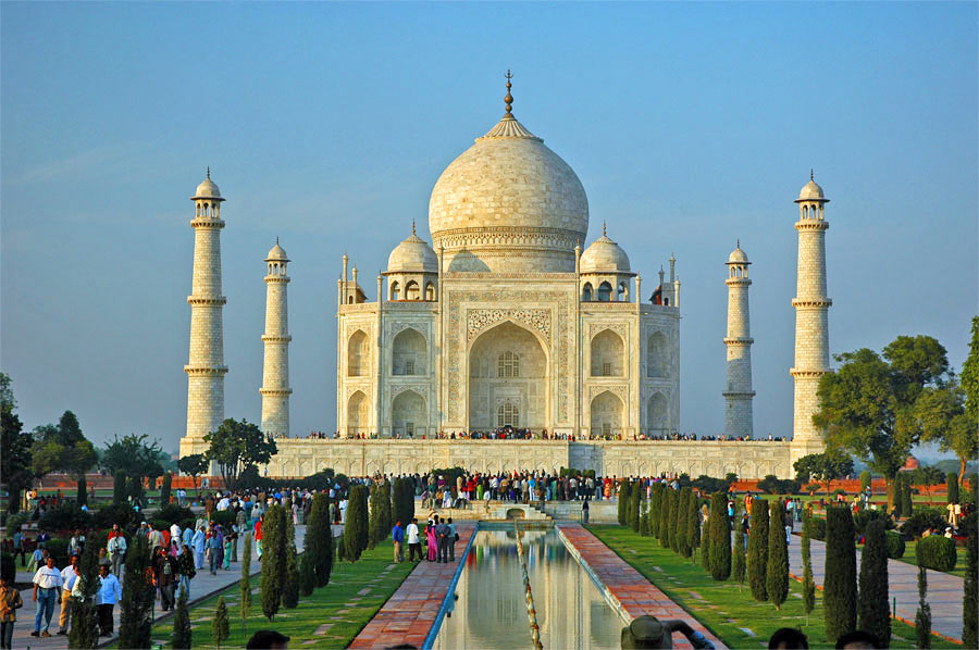 Тадж-Махал. Агра. Индия. Памятником исламской архитектуры в Индии является купольный мавзолей Тадж-Махал в Агре, усыпальница Шаха-Джахана и его любимой жены Мумтаз-Махал. Тадж-Махал расположен на прямоугольной платформе из красного песчаника. Его арочный портал обрамлен каллиграфическим орнаментом, инкрустированный черным сланцем по белому мрамору. Здание венчает огромный белый купол луковичной формы с устремленным ввысь золоченым шпилем. По углам взметнулись четыре стройных трехъярусных минарета, увенчаных башенными павильонами с куполами.