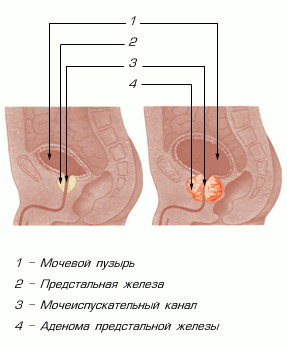 Нормальная (слева) и увеличенная (справа) предстательная железа.