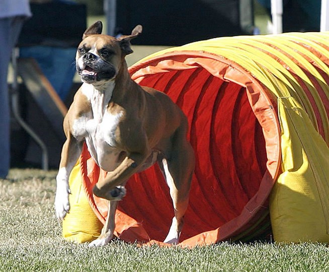 Аджилити. Боксер преодолевает туннель.