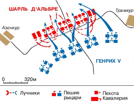 Битва при Азенкуре 25 октября 1425 года. Войска английского короля Генриха V, состоящие из 3-5 тысяч лучников и 1 тысячи спешенных рыцарей, нанесли поражение десятитысячной французской армии под командованием коннетабля Ш. д'Альбре. Исход битвы определили организованность и подвижность английских отрядов с одной стороны и недисциплинированность французской феодальной армии с другой. Потери французов: около 4 тысяч убитых и 1, 5 тысячи пленных.