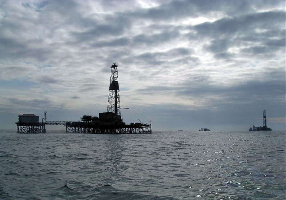 Азербайджан. Нефтедобывающая платформа в Каспийском море близ Баку.