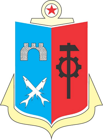 Герб Азова, принятый 3 июля 1967 года. Щит рассечен лазурью и червленью, в первом поле серебряные крепостные ворота над двумя серебряными скрещенными рыбами; во втором поле черный молоток, положенный на шестерню. Щит имеет оригинальное обрамление в виде золотого якоря, в проушину которого вписана червленая звезда.