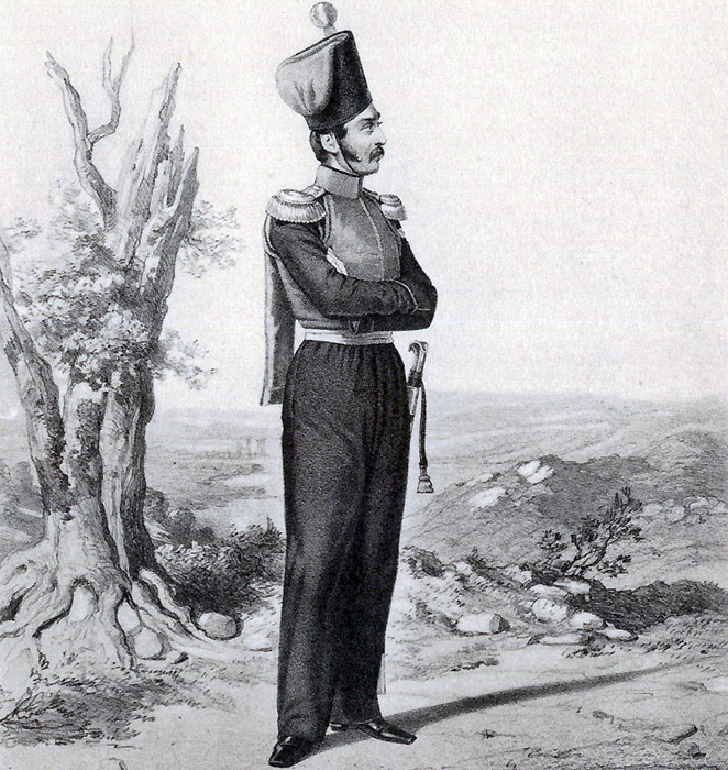 Штаб-офицер Азовского казачьего войска. 1838-1840 годы. Куртка малиновая, с таким же воротником и темносиними рукавами, с малиновой выпушкой по краям обшлагов; шаровары синие без лампас; выкид у шапки малиновый; помпон, репеек, кутасы и кушак — белые.