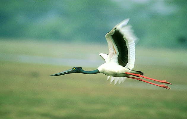 Черношейный аист, или азиатский ябиру, в полете. Широко распространен от Индии до Новой Гвинеи и Северной Австралии.