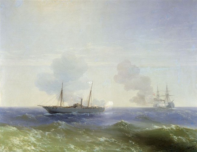 И.К. Айвазовский. Бой парохода «Веста» с броненосцем «Фехти-Буленд» 11 июля 1877 года. Холст, масло. 1877 год.
