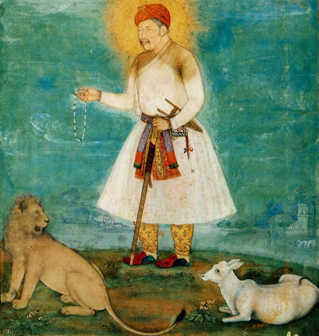 Говардхан. Портрет Акбара с львом и ланью. Около 1630 года. Метрополитен-музей.