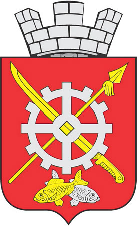 Герб Аксая, принятый 16 июня 2004 года. В червленом поле золотые шашка и копье (с кистью у наконечника), продетые сквозь серебряное зубчатое, колесо, сопровожденное двумя рыбами, серебряной и поверх нее золотой. Щит увенчан серебряной башенной короной. Герб может воспроизводиться как с короной (полный герб), так и без нее.