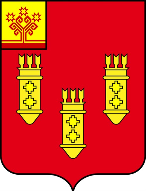Герб Алатыря впервые был утвержден 22 декабря 1780 года: «В червленом (красном) поле три золотых колчана наполненных стрелами: два и один». В верхнем левом углу — элемент флага Чувашии.