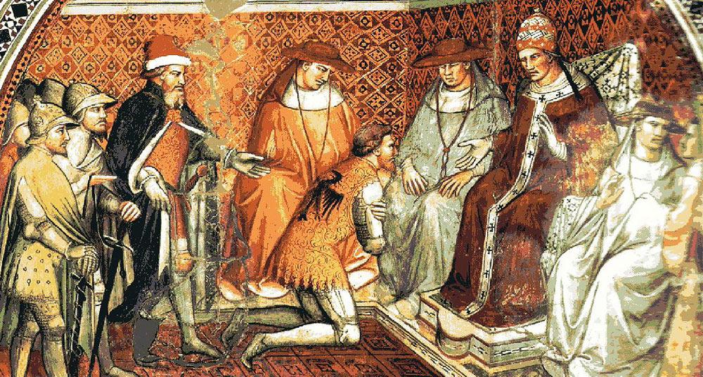 Признание Фридрихом Барбароссой папы Александра III. Фреска из Палаццо Пубблико в Сиене работы Спинелло Аретино.
