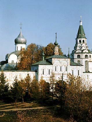 Александров. Ансамбль Александровской слободы. Крайняя справа — Распятская церковь-колокольня (1560-е гг.). В 17 веке на месте слободы возник Успенский монастырь, для которого выстроены стены с башнями и надвратной церковью.
