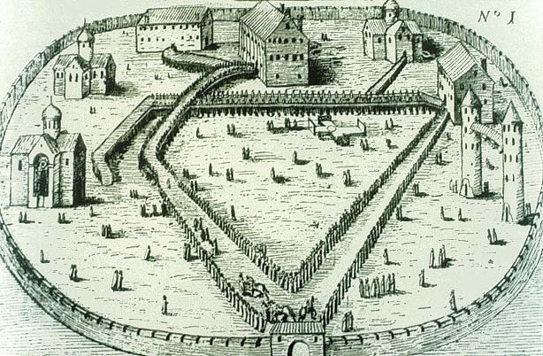 Александровская слобода в 1578 году. Гравюра из книги Я. Ульфельда «Описание путешествия в Россию». Франкфурт, 1626 год.