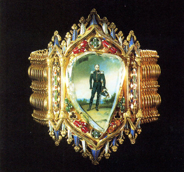Алмазный фонд Российской Федерации. Алмаз (свыше 25 карат) с портретом Александра I, вставленный в браслет. Первая четверть 19 века.
