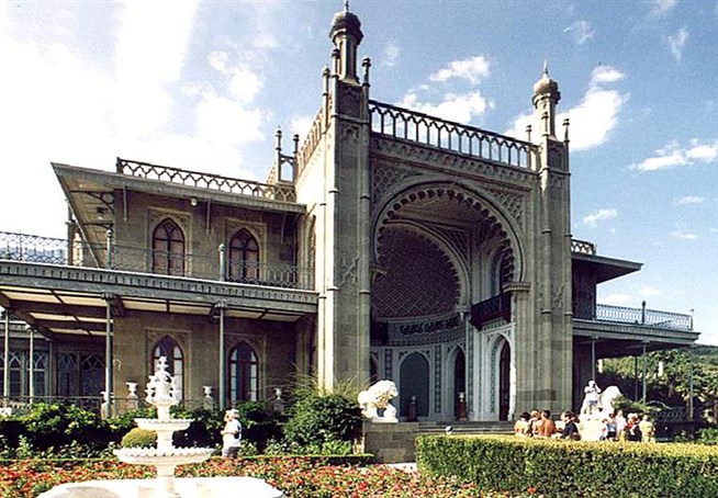 Алупка. Южный фасад Воронцовского дворца. 1829-1848 (в мавританском стиле), архитектор Э. Блор. В ансамбль дворца входят: главный, библиотечный и шуваловский корпуса, часовая башня и башни западного входа, терраса с мраморными львами, дворцовый дворик, зимний сад, фонтаны и др. постройки.