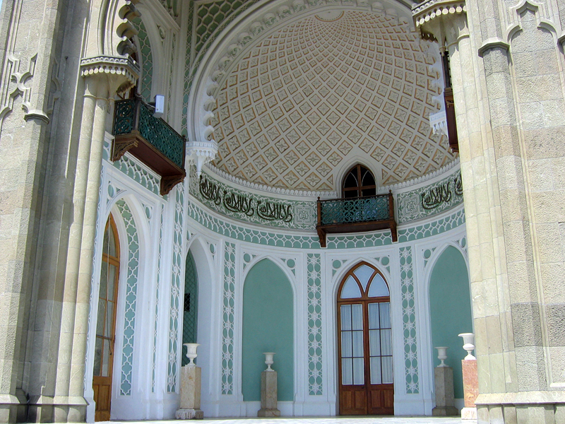 Алупка. Воронцовский дворец — главный вход. Дворец выполнен в мавританском стиле по проекту архитектора Э. Блора в 1829-1848 годах. В ансамбль дворца входят: главный, библиотечный и шуваловский корпуса, а также часовая башня и башни западного входа, терраса с мраморными львами, дворцовый дворик, зимний сад, фонтаны и др. постройки. Фото В.В. Хороса.