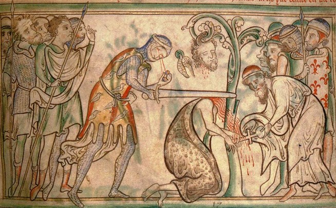 Мученичество святого Альбана. Миниатюра из жития святого Альбана 13 века. Библиотека Тринити-колледжа, Дублин. Автор манускрипта и миниатюр — Матвей Парижский.