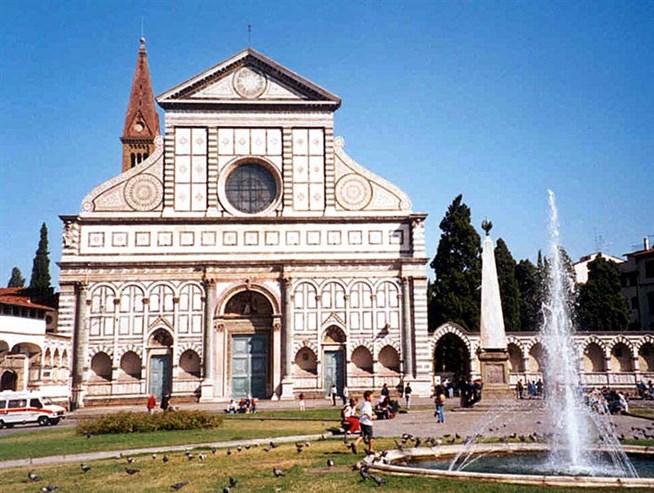 Церковь Санта-Мария-Новелла во Флоренции. 1279-1470 гг. Фасад церкви — результат переделки, предпринятой Леоном Баттистой Альберти в 1456-1470 гг. Архитектор создал портал и всю верхнюю часть церкви с четкой ритмикой квадратов, инкрустированных мрамором.