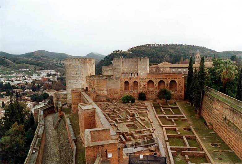 Альгамбра (Гранада). Считается жемчужиной мавританской архитектуры. В ансамбль входили помещения, павильоны, залы, мечеть, гарем, баня. Альгамбра расположена на вершине холма, господствующего над городом, и органично вписана в окружающий ландшафт. Мощная крепостная стена красного цвета (отсюда название — «аль-хамра» — с арабского «красная») отделяет дворцовые постройки от внешнего мира.