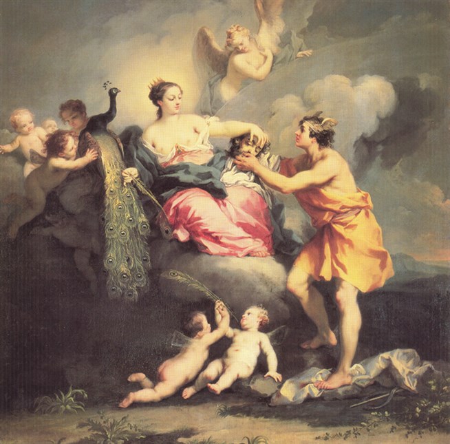 Якопо Амигони (1685-1752). Юнона получает голову Аргуса. Около 1730 года. Холст, масло. Особняк Мур-Парк, Рикмансворт, Хартфордшир, Англия. Юнона, жена Юпитера, поручила великану Аргусу следить за богиней Ио, которую подозревала в связи со своим мужем. По приказу Юпитера бог Меркурий убил Аргуса. Мягкий, чувственный стиль, светлые тона, грациозные линии этой картины типичны для эпохи рококо.