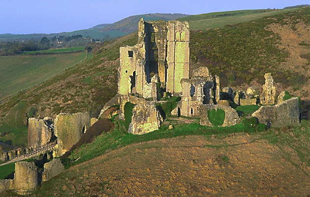 Руины замка Корф, разрушенного парламентскими войсками в ходе гражданской войны в Англии в 1646. Дорсет. Англия.