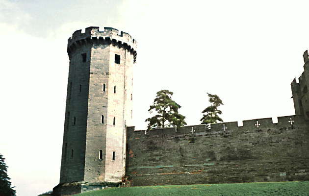 Угловая башня и стены замка в графстве Уорикшир. 14 века. Англия.