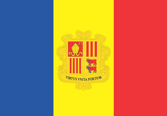 Представляет собой прямоугольное полотнище с соотношением сторон 7:10. состоящее из трех неравнозначных вертикальных полос ― синей, жёлтой, красной. Ширина полос соотносится друг с другом в пропорции 8:9:8. Посередине флага, в центре полосы изображен герб Андорра.
