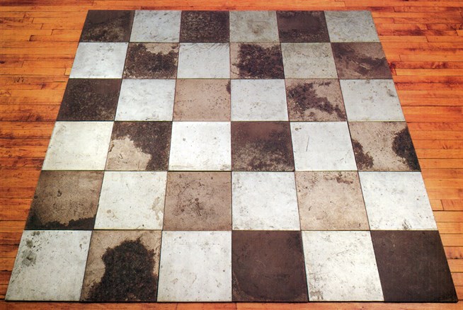 Карл Андре. Магниево-цинковая плоскость. 1969 год. Цинк, магний. Балтиморский музей искусств. Тридцать шесть квадратов из магния и цинка выложены на полу в шахматном порядке.