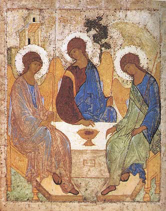 Андрей Рублев. «Троица». 1420-е годы. Икона из Троицкого собора Троице-Сергиева монастыря. Третьяковская галерея. Высокий гуманизм Андрея Рублева, ясность и чистота его нравственных идеалов с наибольшей полнотой и силой проявились в самом совершенном его творении — иконе «Троица». Основой композиционного решения является круг, образуемый сочетаниями сияющих ангелов. «Троица» Андрея Рублева стала высоким образцом для многих поколений русских иконописцев.