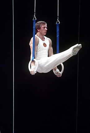 Николай Андрианов — целая страница в отечественной спортивной гимнастике. Семикратный олимпийский чемпион, абсолютный чемпион мира. Он сумел вернуть мужской отечественной гимнастике былую славу Виктора Чукарина, Бориса Шахлина, Михаила Воронина. На снимке: упражнения на кольцах. XXII Олимпиада (Москва, 1980).