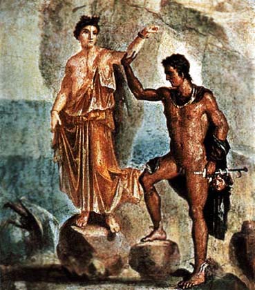 Персей и Андромеда. Фреска из дома Диоскуров в Помпеях: 65-70 н. э. Национальный музей. Неаполь.