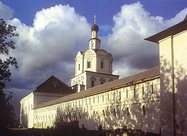Андроников монастырь был основан в 1360 на высоком берегу Яузы. За белоснежными крепостными стенами (17 в.) монастыря вызвышается храм Михаила Архангела (1694), служивший усыпальницей Лопухиных — родственников первой жены Петра I. Построенный в стиле московского барокко, он имеет пышный декор: колонны, пилястры, узорную кладку кирпича на карнизах, оконные наличники с сандриками, раковины в закомарах восьмерика. К собору примыкает трапезная палата с могучими стенами и маленькими оконцами (1504).