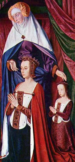 Анна Французская со святой покровительницей и дочерью Сюзанной. Правая створка триптиха из собора в Мулене. 1498-1499 годы. Дерево.