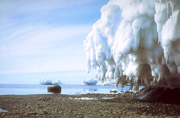 Лето. Антарктика. Материковый лед постепенно сползает к океану, где от него откалываются громадные куски льда — айсберги.