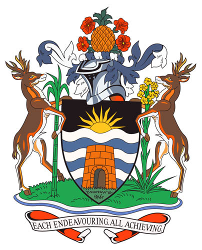 Герб Антигуа и Барбуды. На щите герба изображены солнце на черной полосе, волны, соответствующие синей и белой полосам флага, а также каменная башня с мельницей для переработки сахарного тростника. Над щитом — традиционный для английской геральдики шлем с белым и синим венками и наметом под цвет волн щита. Шлем увенчан образцами местной флоры — цветами малинового гибискуса и ананасом. Щит герба Антигуа и Барбуды установлен на острове, окруженном волнами. По бокам щита — сахарный тростник и агава. Фауну представляют поддерживающие щит олени — эндемики Барбуды. Девиз на английском языке означает «Старается каждый, достигают вместе».