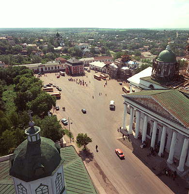 Центральная (бывшая базарная) площадь Арзамаса. От нее веером развернуты улицы верхней части города. Планировка относится к началу 19 в. Справа — 8-колонный ионический портик Воскресенского собора.