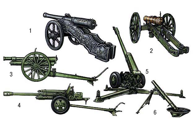 Артиллерия: 1 — пищаль, 17 в.; 2 — полевая пушка, 1805; 3 — пушка (76 мм), 1902; 4 — дивизионная пушка (76 мм), 1942; 5 — гаубица (122 мм) Д-30, 1960; 6 — полковой миномет (120 мм), 1938.