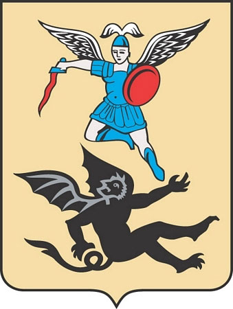 Описание: В золотом щите — Святой Архистратиг Михаил в лазоревых (синих, голубых) доспехах и в червленых (красных) сапогах, держащий червленый пламенеющий меч острием книзу и лазоревый щит, который украшен золотым крестом (сообразно щиту) и имеет лазоревую кайму, и попирающий черного опрокинутого головой влево ангела тьмы.