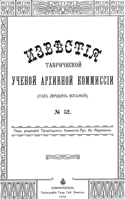 Известия Таврической ученой архивной комиссии. № 52, 1915 год. Титульный лист.